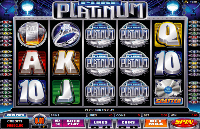 The Pure Platinum slot machine is one of our featured New Slots and this one comes with 40 paylines, and with a name like this you are expecting one of the worlds most precious metals to be apparent, well you won't be disappointed and thanks to its huge paying jackpots you could soon find you making your way to the jewellers to get your very own platinum if the reels start t spin your way!